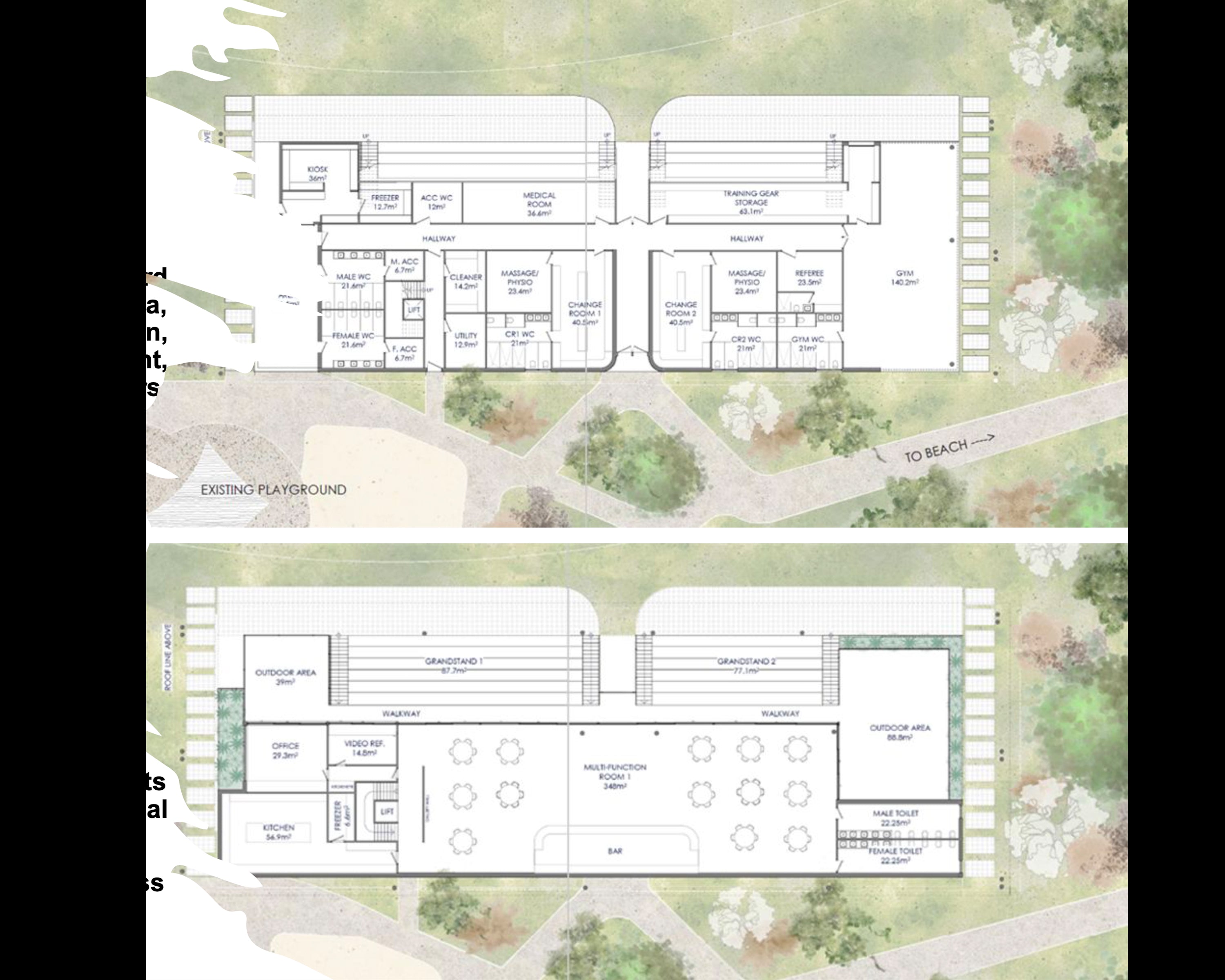 • Avoca Beach Rugby has partnered with Pinnacle DesignArchitects who are experienced in designing sporting"centres of excellence" for professional sportingorganisations. We will develop a proposal which deliversa facility that includes a large community style hall,commercial kitchen, public and disabled amenities andaccess, a modern gymnasium, medical room,changerooms and electronic capabilities. This is vitallyimportant in the preparation of players for the morephysical aspects of the game.